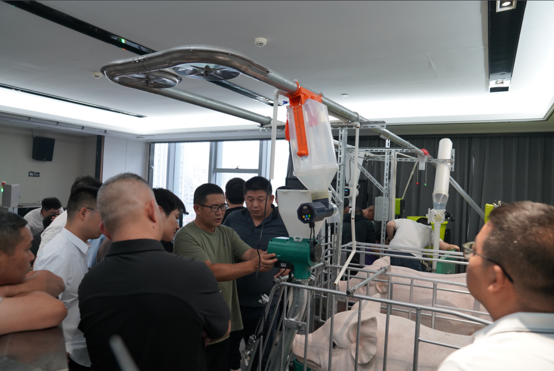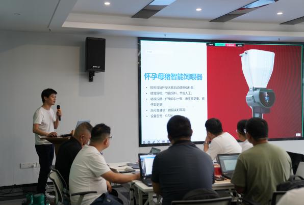 隨后潤農羅清經理介紹母豬飼喂器、懷孕飼喂器和粥料器等智能飼喂設備的應用場景及價值點,展示飼喂器實物和講解安裝操作方法。接著至潤農展廳進行參觀,現場進行設備安裝調控操作和控制平臺操作的培訓,確保每個服務老師能講、能裝、能調試、能維護,為客戶實現膘體管控+潤農飼喂器的“一條龍”服務。